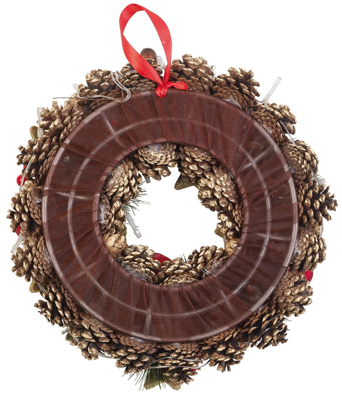 - Couronne classique avec branches de sapin, glands, baies et fleurs, boules de Noël, étoiles et vraies pommes de pin