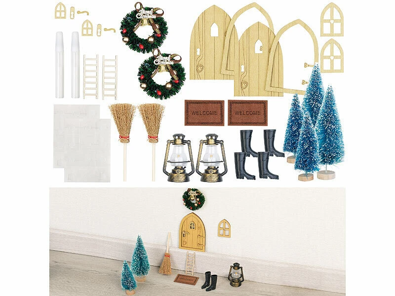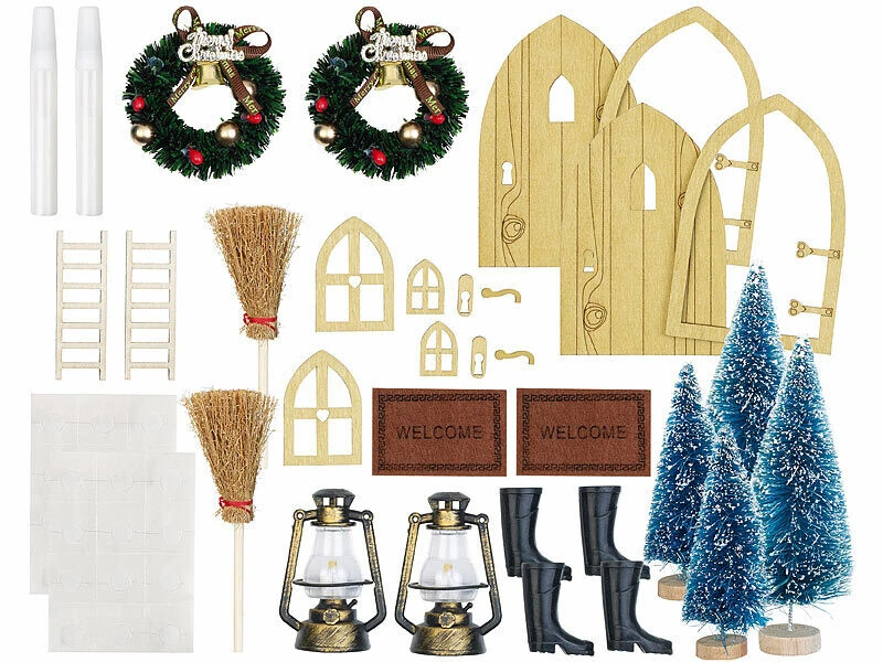 - Pack de 2 kits de décoration de Noël avec 2 portes, 2 fenêtres, 2 échelles, 2 couronnes, 2 balais, 4 sapins de Noël (2 grands et 2 petits), 2 paillassons, 4 bottes, 2 lampes à huile, 2 colles (6 ml chacune), 2 patchs adhésifs et mode d’emploi en français
