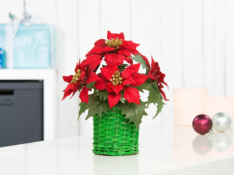 Egayez votre maison avec cette composition hivernale. Disposés dans votre salon, sur un buffet ou un rebord de fenêtre, les poinsettias rouge sombre au cœur doré apportent une ambiance à la fois festive à votre intérieur.
