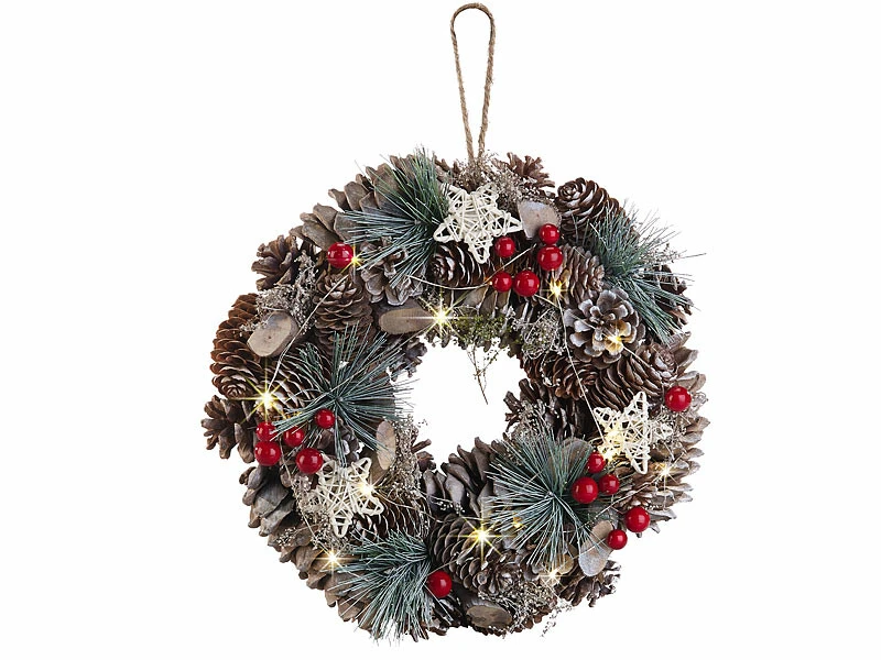 Cette couronne de Noël lumineuse, avec des reflets rouges, est décorée de branches de sapin, d’étoiles, de baies rouges et de petites pommes de pin.