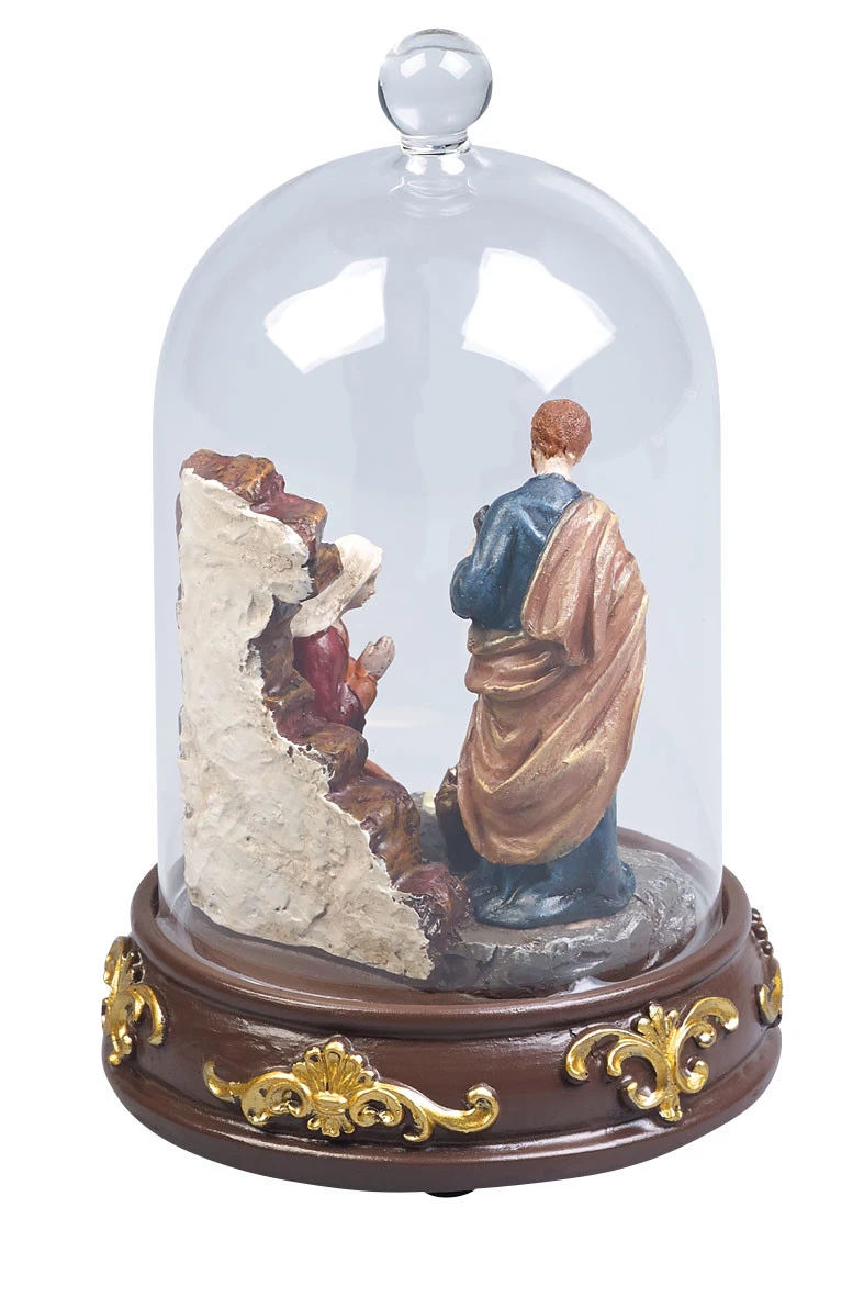 Les trois figurines peintes à la main sont protégées sous une cloche de verre et éclairées par trois LED blanc chaud.