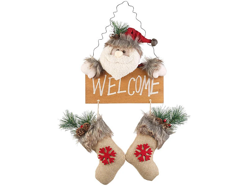 - Design jovial : le Père Noël tient un panneau en bois contenant l’inscription « Welcome » (Bienvenue), et porte une clochette en guise de pompon