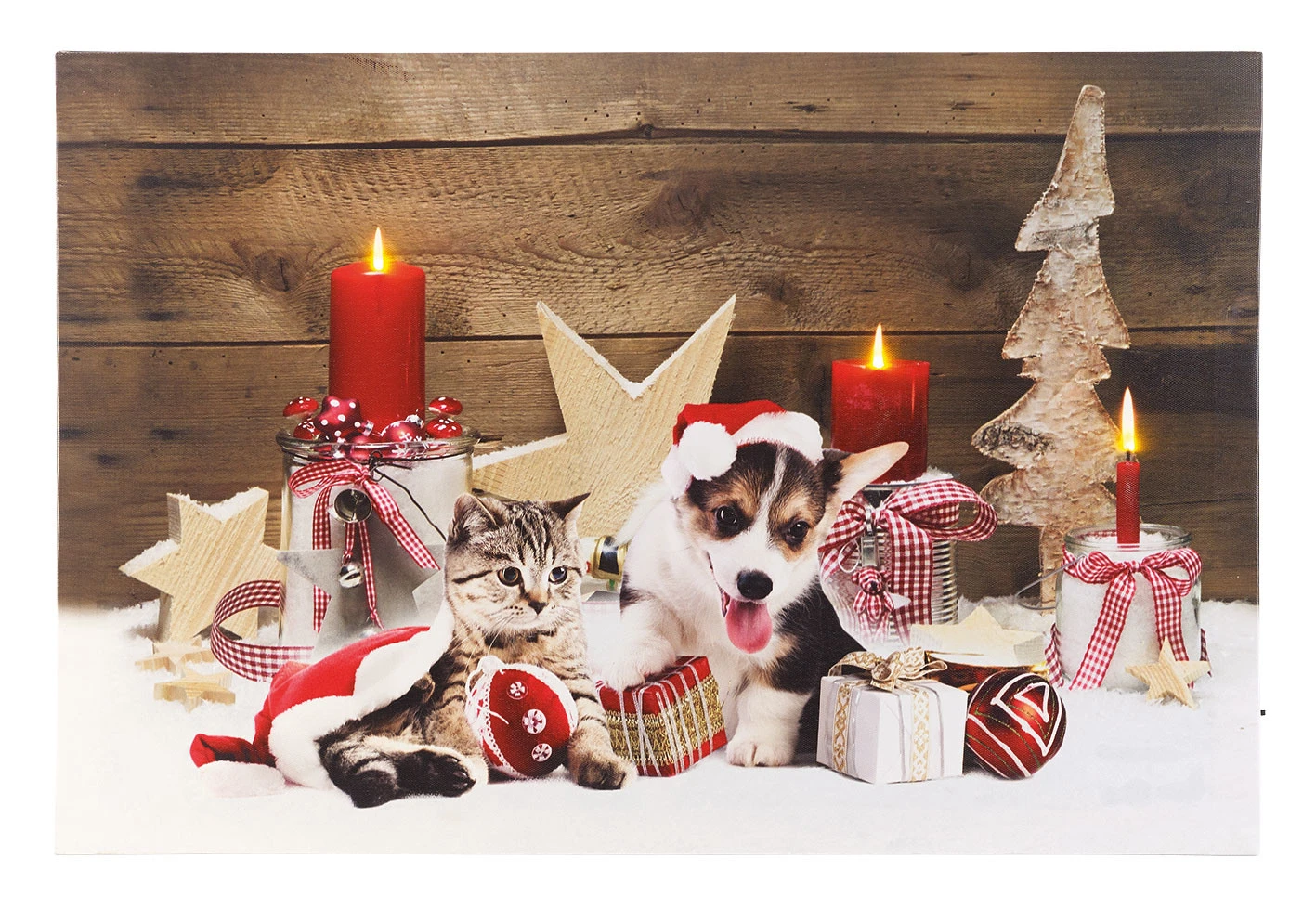 Ce tableau lumineux représente des bébés animaux près pour fêter Noël. Ces adorables boules de poils créeront une ambiance de Noël douce et pleine de tendresse, qui réjouira petits et grands. Des LED sont dissimulées derrière chaque flamme de bougie, apportant une touche féerique à cette décoration qui enchantera toute la famille.