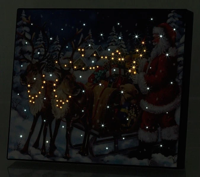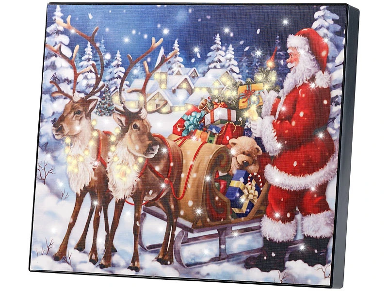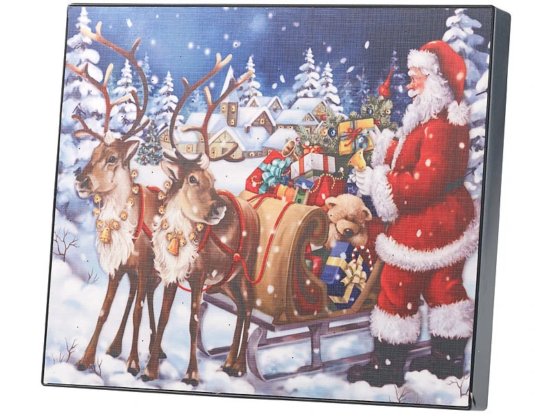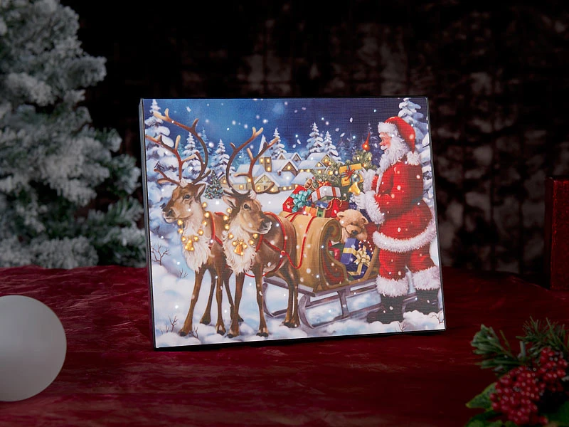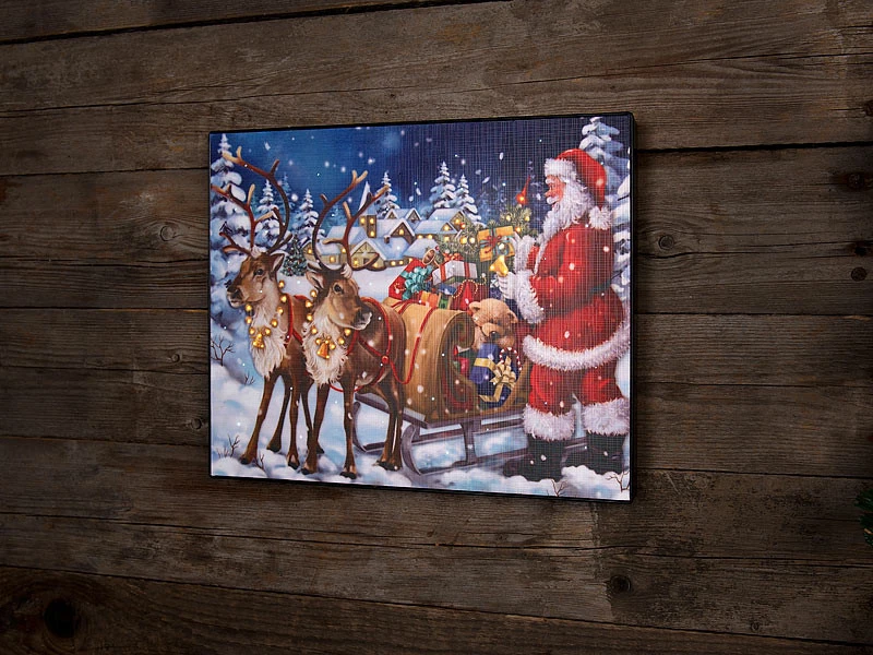 Le tableau à LED « Père Noël et son traîneau » représente le Père Noël préparant son traîneau et ses rennes près d’un village sous la neige, à la façon des calendriers de l’Avent traditionnels. L’ambiance hivernale et la magie de Noël résumée en une seule image.